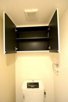 トイレには上部に大きな吊り棚があります。トイレットペーパーのストックやお掃除道具など、床に置いておきたく無い物をスッキリと収納して清潔にお使いください(^o^)