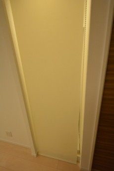 リビングダイニングキッチンには洗濯機置場があります。目隠しにロールカーテンが設置されているので、すっきり見せる事ができますね(^v^)