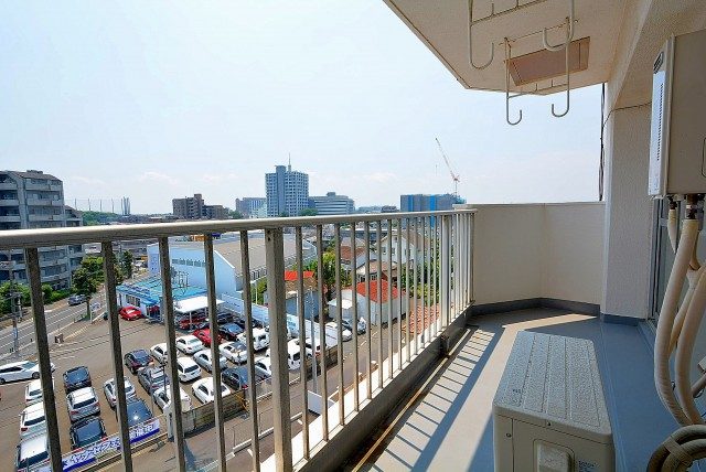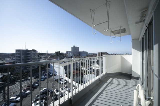 広さ7.90㎡、南西向き。幅奥行き十分な陽当たり抜群のバルコニーです。これならお洗濯物も気持ち良く乾きそうですね。物干し金具付き。