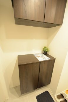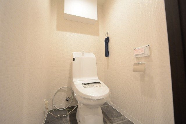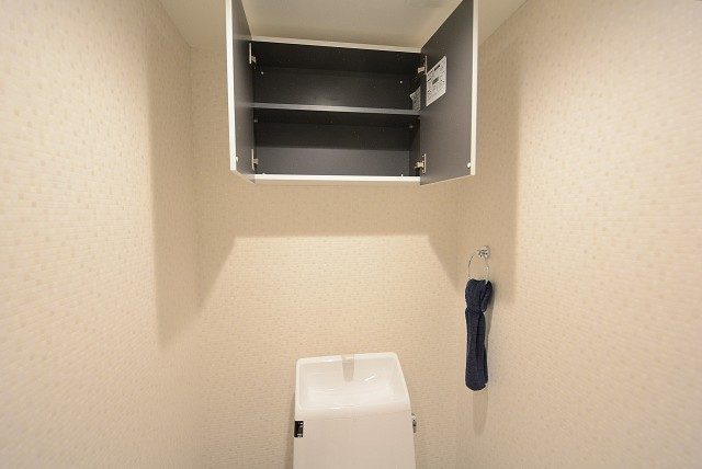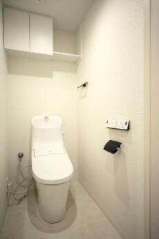 その隣はトイレになっています。INAX製の洗浄機能一体型。トイレットペーパーや掃除道具を入れておくのに便利な吊戸棚も付いています。