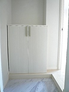 扉をあけますと、コンパクトではありますが、カウンター付き玄関収納もしっかりとあり、