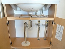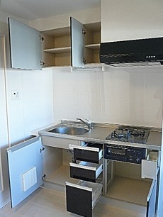 システムキッチンです。上下にしっかり収納もあり、スッキリとしたキッチンでお料理ができそうです。シンク左下にはちょっとした収納スペースもあります。少しのスペースでもこのように活用できると嬉しいですね。