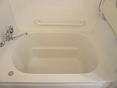 サニタリールーム入り右側にある清潔感漂うバスルームです。トイレ同様こちらにも浴槽のそばに手すりがあります。