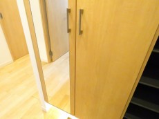 表扉の一部には縦長の鏡も設置されており、お出かけ前の身だしなみチェックもサッと出来て便利です。下からのライトで足元が明るいのもいいですね。