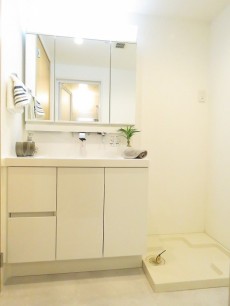 洗面室。洗面化粧台、洗濯機置場、バスルームがまとまっています。
