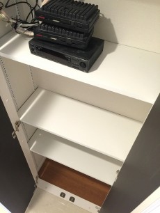 向かい側には収納棚。一番上の棚に乗っている黒い機器は有線のチューナーです。料金はかかりますが、いつも音楽のある生活っていいですよね。