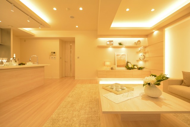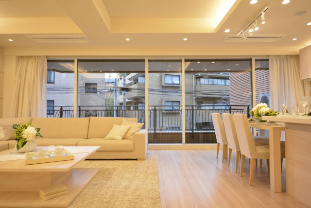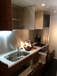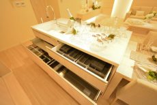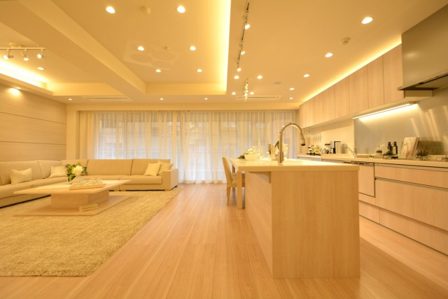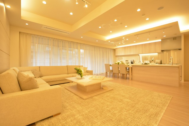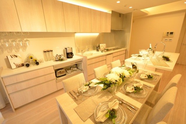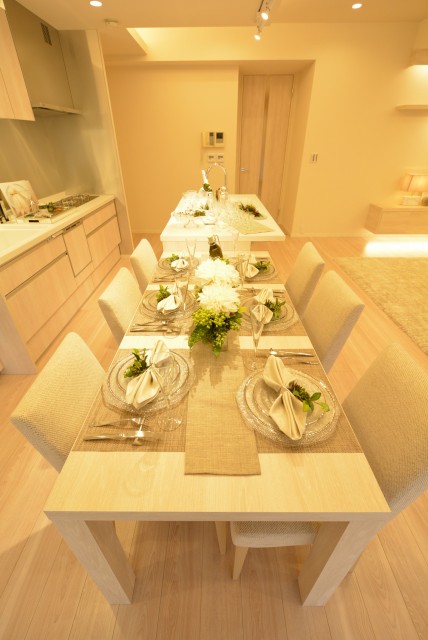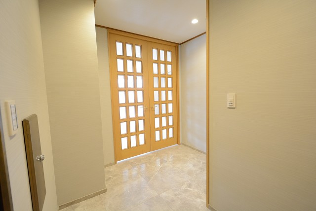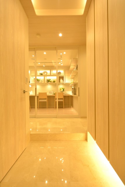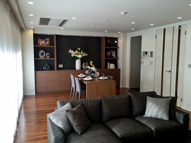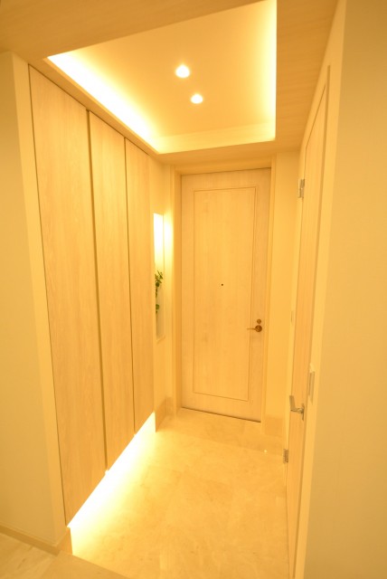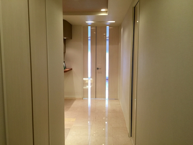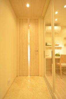 扉を開けるとまばゆいくらいの真っ白な天然大理石張りの広々とした玄関がお出迎え。玄関左手にリビングダイニングキッチン、右手にベットルームという配置になっています。プライベートエリアとリビングダイニングがしっかり分かれていますので、来客の多い方には嬉しい造りです。お友達をたくさん呼んでパーティーにはもってこいです。