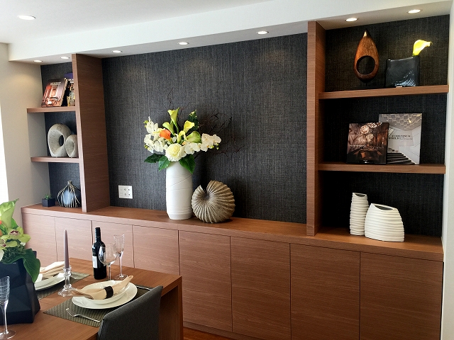 北西の壁には飾り棚が設置されています。ブラウンの木調とグレーのシックなデザインクロスのステキな飾り棚。こちらに飾るインテリアがお部屋の印象を決めます♫あなたのセンスの見せ所(*´˘`*)♡下の部分は扉付きですので、ゴチャゴチャかさばる物はこちらにお仕舞いただけます。