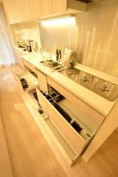 収納は、上部とシンク下の2か所にあります。シンク下の収納はスライド式で配管を気にせずたっぷりキッチンツールがしまえます。