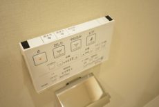 お洒落な洗面台付き、ウォシュレットの操作パネルはリモコン式