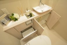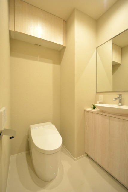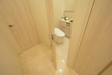 クローゼットのお隣は、落ち着いた印象のトイレです。もちろんウォシュレット付き。手洗いや収納キャビネットも設置されています。来客用のトイレにもバッチリです。