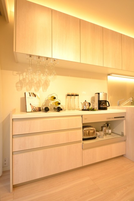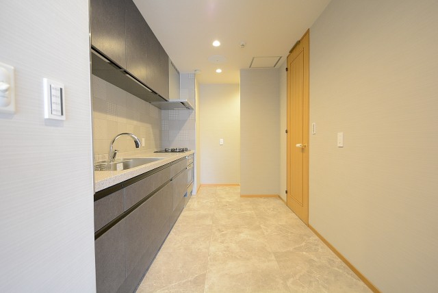 キッチンスペースはブラックのタイルと木調キャビネットのシックな空間。独立した空間で、バリバリお料理を楽しみましょう♫