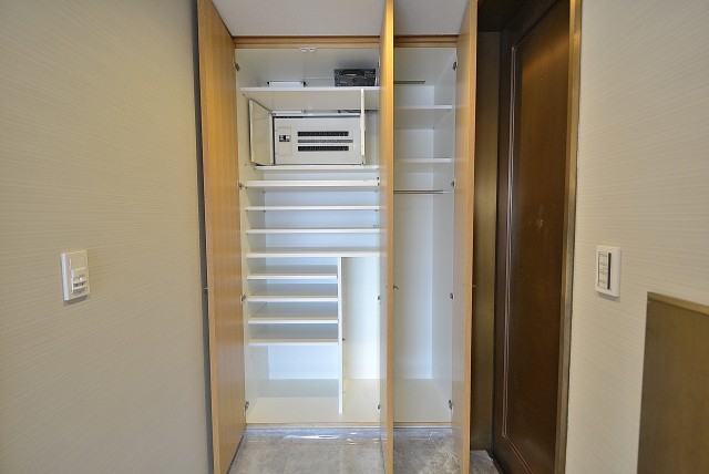 それでは、玄関を右手に進んで行きたいと思います。右手には、可動式の棚が嬉しいクローゼットが用意されています。棚の一番上には、有線の機械があります。こちらの物件には、有線が設置済みで、お部屋に設置してあるツマミを回せばお部屋に音楽が流れるかたちになっています(*´˘`*)♡