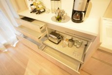こちらには、家電が置けるようになったスペースがありました。コンセントはもちろんの事、換気扇が付いていて炊飯器などの湯気も大丈夫(^^)v