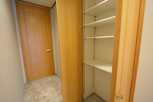 廊下に戻って、突き当りには、クローゼットが設置されています。収納が多いと生活スペースを広くとれて嬉しいです。