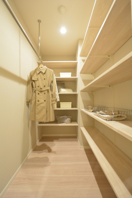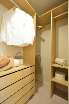 広いウォークインクローゼットになっていました。ハンガーポールの他、棚や引き出しも設置されています。