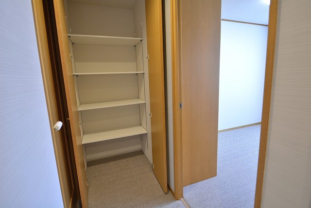 収納はゆとりのあるウォークインタイプ。上部には棚があり、大きなものから小さなものまでたっぷり収納できちゃいます☆バーも付いているので、ロングコート等の衣類の収納にも良いですね♪♪収納が大きいと生活スペースが広くなりますので嬉しい味方。