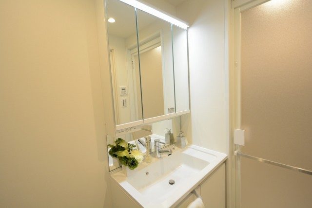 水栓の後ろまで広がる大きな鏡で、毎朝の身支度も抜けなくばっちり☆!?