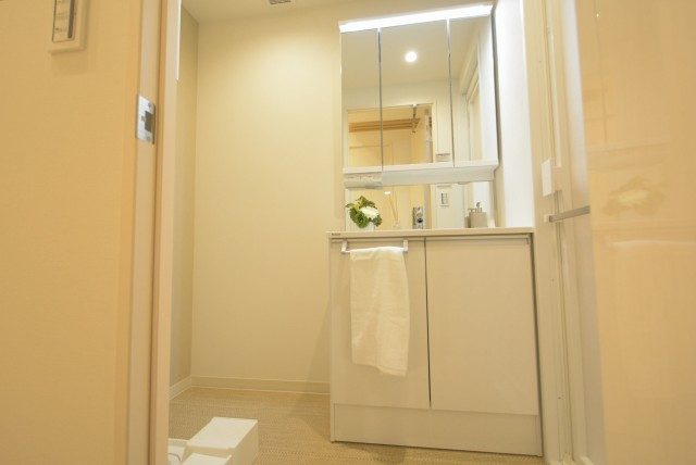 洗面室には洗面化粧台の他に、トイレ、洗濯機スペース、リネン棚がまとまっています。洗面化粧台に付けられた三面鏡は身だしなみを整えるのに便利。裏がキャビネットになっているので洗面周りを片付けるのにも役立ちます。