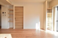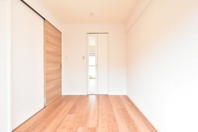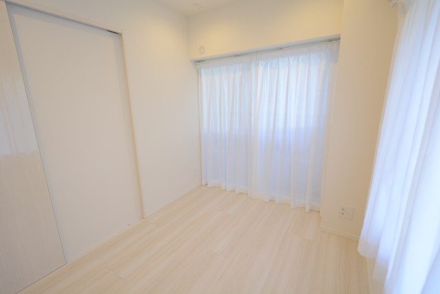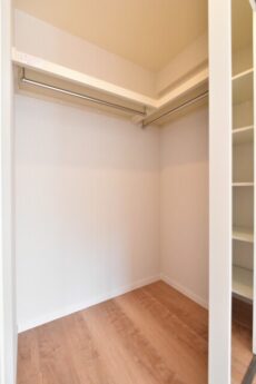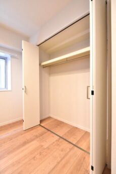 LDKに隣接したお部屋で南向きバルコニーに面しています。仕切りの扉は引き込み式なので開放してLDKの一部として使うことも可能。吊り下げ扉で床にレールが無いのも一体感があっていいですよね。もちろん、閉めれば独立した洋室としても使えますよ。ウォークインクローゼット付き。