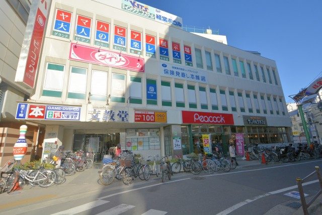 駅前にスーパーピーコックやドラッグストア、100均をはじめとし、本当ににぎやか…