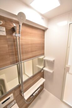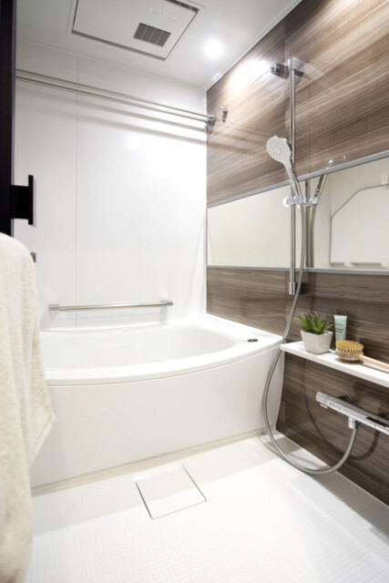 浴室は白を基調に木目のアクセントウォールをプラスした落ち着い雰囲気。一日の終わりをのんびり過ごすのにピッタリの空間です。追い焚き機能や浴室換気乾燥機などの便利機能も充実!天気を気にせず洗濯出来るのが嬉しいですね♬