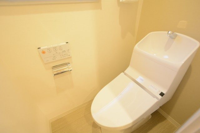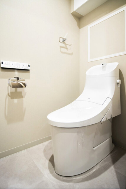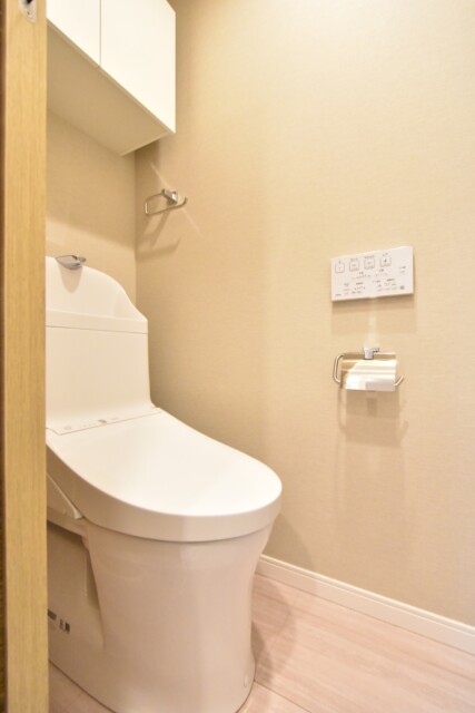 トイレはLIXIL製の洗浄機能付き。トイレットペーパーのストックなどを入れておける吊戸棚も付いています。