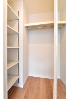 キッチン横には収納付。食品ストックを入れたり、リビングに散らかりがちな細々としたものを片付けるのに使えます。奥行があるのでフロアモップなども入りそう。棚は動くので入れるものにアジャスト可能です。