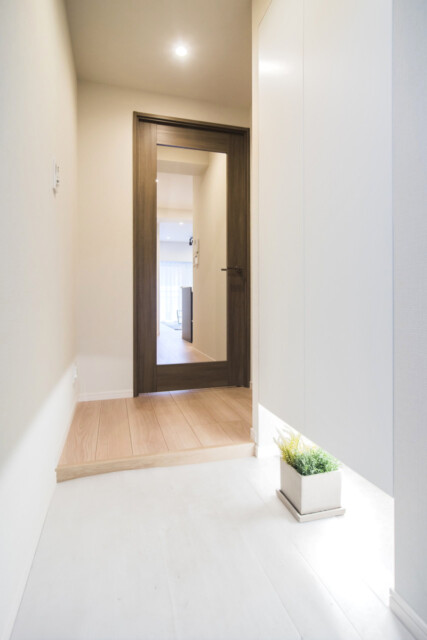 玄関は真っ白で明るい雰囲気。長い廊下ではなくコンパクトなホールへと続いています。コンパクトと言ってもガラスドアになっているので窮屈な感じもしませんし、その分お部屋が広くなると思えばこれはアリですよね。トールタイプのシューズボックスは収納力抜群!