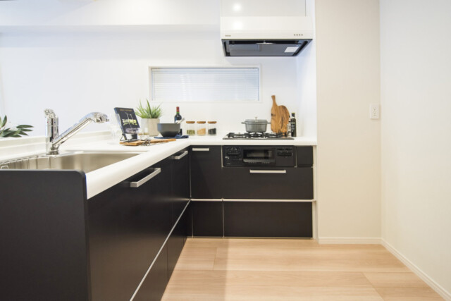 L字型は作業スペースが広くとれ、調理中の移動距離が短いのが特徴。さらに、コンロは前が壁なので油跳ねの心配がいらず、シンクからはLD部分が見渡せる、壁付けキッチンとカウンターキッチンの良い所を兼ね備えたキッチンです。白のトップは人造大理石でお手入れも楽々ですよ。
