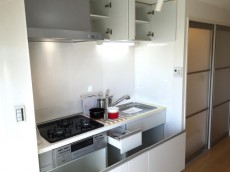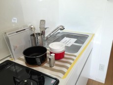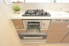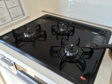 コンロは2口のグリル付きガスコンロ、水栓は浄水機内蔵型となっております。水栓はシャワーヘッドなので、シンクの隅々まで水を流すことが可能です。