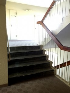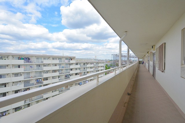 エレベーターを降りると数段ですが、階段があります。階段を上ると開放的な外廊下です。