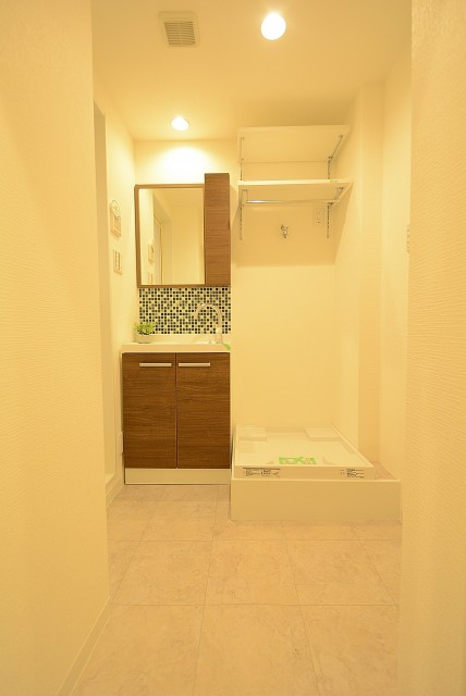 ミラー横にはシャンプーなどのボトルもキレイに並べて置ける棚があり、清潔感のある空間を保てます♪♪モザイクパターンの床は、すばやく乾燥、楽々お手入れ♫