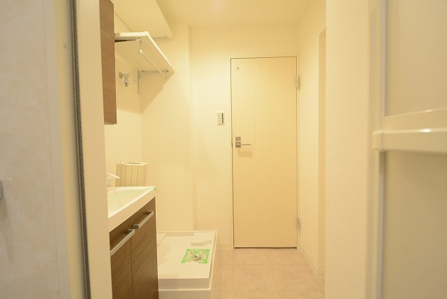 玄関を進み左手に水回りを一か所に集めたサニタリールームです。お掃除もはかどります。右手に洗面台、正面にトイレ、左手にバスルームの並びになっています。