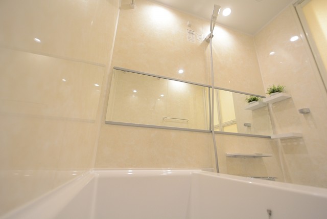 壁には大理石に似た光沢のあるパネルが使われているので、高級感漂う浴室に仕上がっています。