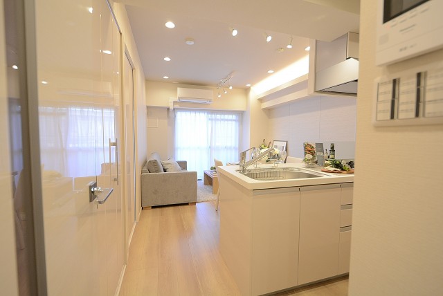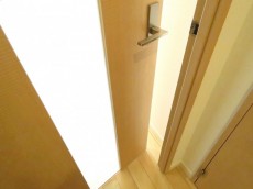 さっそくお部屋の中へ。 玄関には人感センサーがついており、人の気配で自動で照明が消灯します。スイッチを押す手間が省けるうえ、消し忘れが無く経済的です。