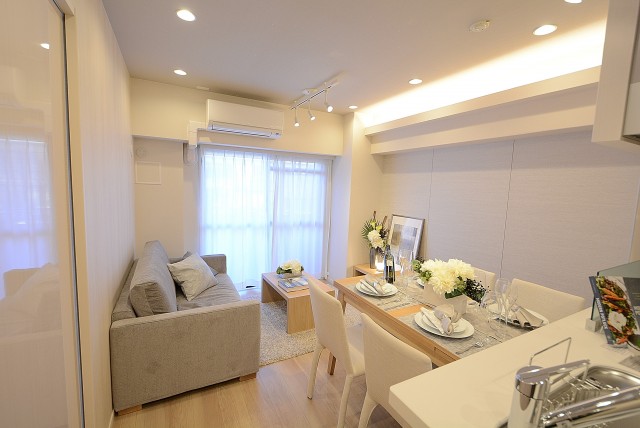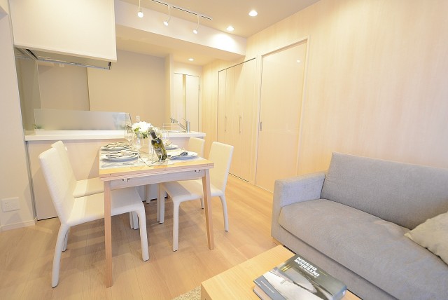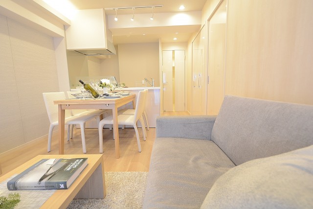 約11.0帖のLDK。ダイニングキッチン、リビングをわけて使いやすい縦長空間です。家具が設置されているので生活のイメージもわきやすいのではないでしょうか?(家具もついてきます。)