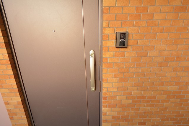 エントランスと同じレンガタイル調の壁にしっかりした造りの扉ですね!
