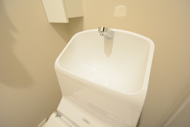 トイレはウォシュレット付き。上にはペーパーのストックを置くのに便利な棚が設置されています。