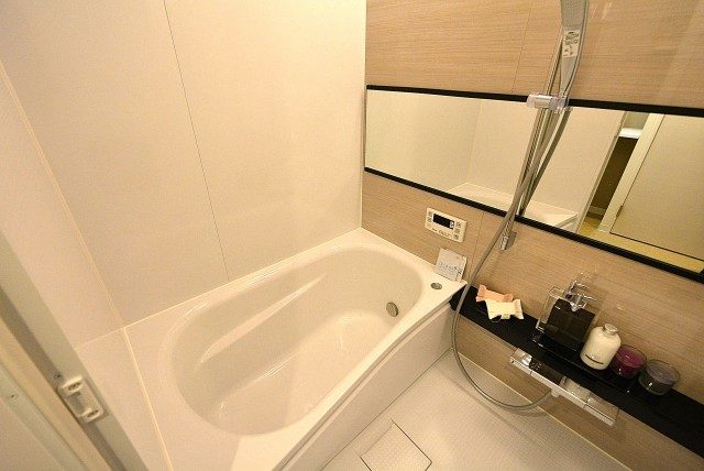 バスルームは、ホワイトの木目調を使いシャープな印象のバスルーム☆ゆっくり大きなバスタブにつかって疲れを癒せそうです♪もちろん追いだき機能付きです♪♪