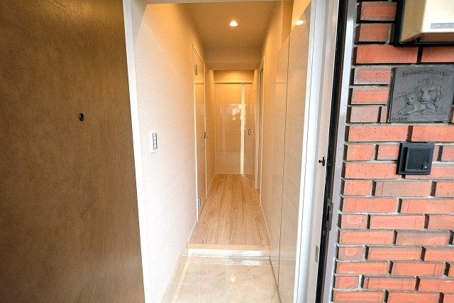 扉を開けると、リノベーションを終え生まれ変わった玄関がお出迎え☆明るい木調の扉が並びます。人感センサーがついているので、人が通ればパッと電気がつきます。消し忘れもなく経済的です。