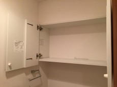 洗面台の左側には棚が付いてますのでタオルなどはこちらに置いておきましょう。