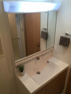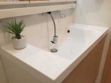 優しい木調キャビネットと清潔感のある真っ白な洗面ボウルの洗面台です。新規交換済みでピッカピカ。