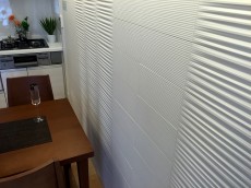 北側の壁は、エコカラットで装飾されています。エコカラットは、見た目が洗練されているだけでなく、ホルムアルデヒトを吸着してくれたり生活臭を軽減したり、調湿機能があったりと、ものすごい実力を持っています。