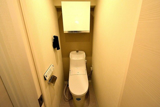 ウォシュレット付きはありがたいですね。吊戸棚は中が2段になっています。トイレットペーパーなどの消耗品もこれだけのスペースがあれば十分に収納できますね!!