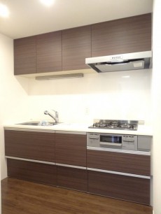 システムキッチンはフローリングにマッチした落ちついた色合いの木目柄。
