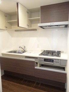 3口コンロ、水栓は浄水器付き、ワークトップは人造大理石とスペックも◎。