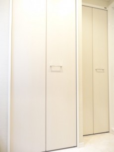 洗面室入口入って正面にあるこちらの扉二つは左側が電気温水器、右側が収納になっています。奥行もあるのでタオルやシャンプー類のストック、着替えなど色々しまえそう。
