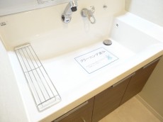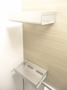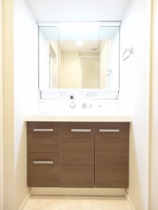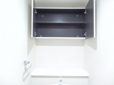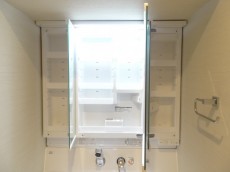 洗面化粧台は3面鏡の裏が一面収納になっており、ゴチャゴチャ散らかりがちな水廻りの小物もスッキリ片付けられそう。横にはタオルハンガーもついています。