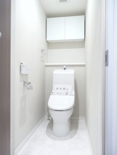 トイレは洗面室を出てすぐ右側に位置しています。ウォシュレットと吊戸棚付き。